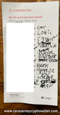The Ledger Nano S hardware wallet uses a BIP39 compatible word list, this means that for a 24 word seed there are 2048 different words that could be used in each of the 24 locations. This makes the odds of cracking a seed phrase successfully a 1 in 2048^24 chance if you don’t know any of the seed words. Those of you who are familiar with the BIP39 word list will notice that some of the words the customer has written on the recovery sheet (such as ‘war’ and ‘dark’) aren’t even in the BIP39 list. Where did these extra words come from ? Your guess is as good as ours.